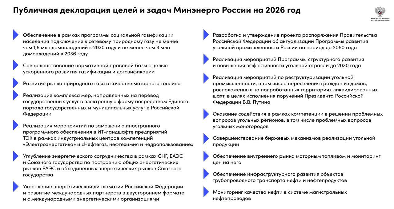 «Задачи Минэнерго России на 2026 год включают обеспечение устойчивого