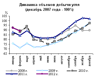 Как отмечается в документах МЭР, рост добычи угля в январе-феврале 2012 г. связан с увеличением спроса на внешнем рынке, а также с увеличением запасов угля у поставщиков и потребителей для бесперебойного обеспечения топливом населения и отраслей экономики в зимний период 2012 года.
