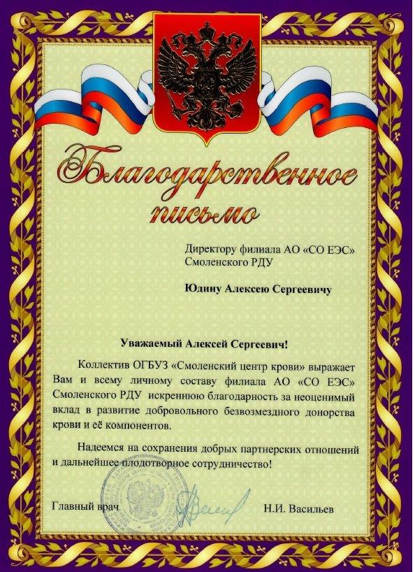 Системного оператора Смоленское РДУ награждены благодарственным письмом